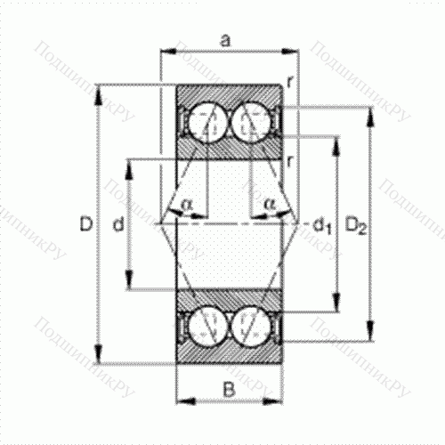 Основные размеры по DIN 628-3, двухрядные, контактные уплотнения с двух сторон, угол контакта ? = 25°